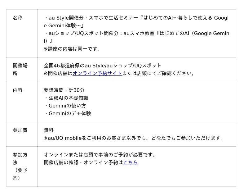 KDDIは2025年9月1日から、GoogleのAIアシスタント「Gemini」を実際に体験いただくことでスマートフォンを通じて生成AIの基礎知識などが学べるセミナー(以下 本セミナー)を、全国のau Style/auショップ/UQスポット(注)で順次開催します。