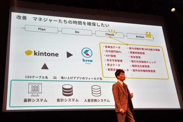 そこで大野氏は、基幹システム・会計システム・人事労務システムをkintoneで構築し、他アプリとはプラグインの「krewData」で連結させた。これにより、役員データや月次部門別PL、KPI管理などの帳票は自動作成され、マネージャーたちは資料づくりから解放された。「Do」の業務においても、若手社員が担当していた「商談来館予定表」「消費者アンケート」「社員出勤簿」といったデータ化されていなかった業務を次々とkintone化していった。