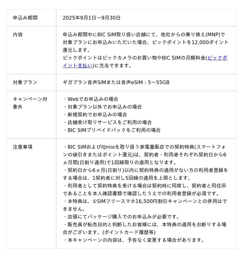 お手持ちの端末をそのまま使いたい方には、他社からBIC SIMへのお乗り換えでビックポイントを12,000ポイント還元いたします。ビックカメラのお買い物に使えるだけでなく、月額料金に充当することで人気の5GBプランが最大1年間実質無料でご利用いただけます。