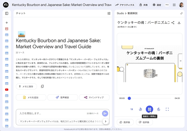 今回紹介するのは、情報を実用的なコンテンツに変換する「Studio」機能だ。まず、紹介したいのが、8月25日に日本語に対応したばかりの動画解説機能だ。蓄積した情報を元に、AIが音声付きのスライドを作成してくれるのだが、ポイントを押さえてわかりやすくまとめてくれるのが凄い。