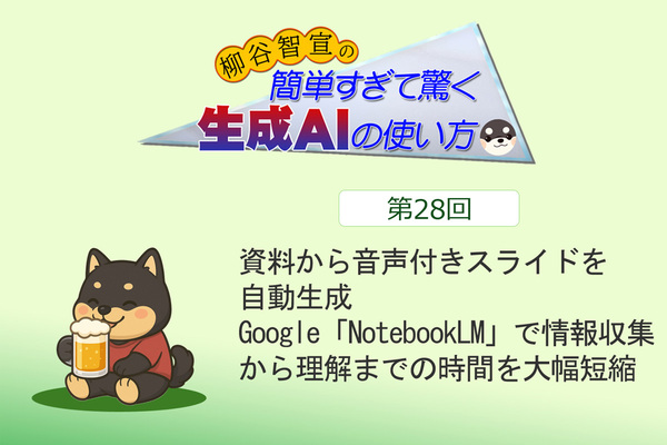 本連載は生成AIをこれから活用しようとしている方たちのために、生成AIの基本やコピペしてそのまま使えるプロンプトなどを紹介。兎にも角にも生成AIに触り始めることで、AIに対する理解を深め、AIスキルを身に着けて欲しい。第28回は情報から音声付きスライドを生成し、音声でも解説してもらえるNotebookLMのStudio機能について解説する。