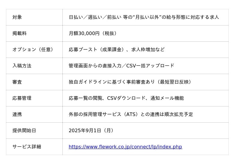 株式会社フレワーク(本社:東京都新宿区、代表取締役:北岸 真一)は、日払い・週払い・前払いに特化した求人サイト『ヒバライドットコム』において、企業が自社求人を直接入稿できる新機能を2025年9月1日(月)に正式リリースしました。月額30,000円+任意の成果課金オプションにより、出稿から応募管理までをワンストップで支援します。