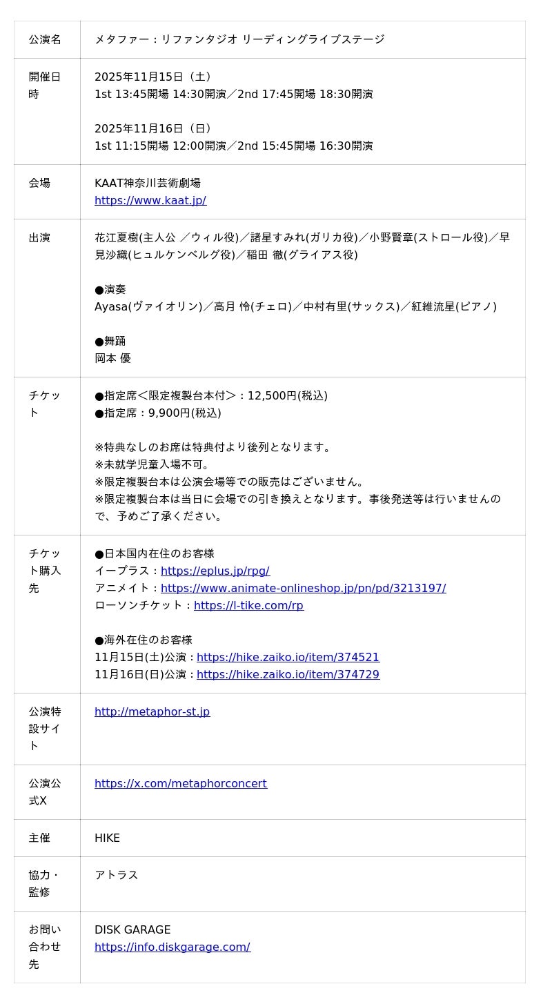 株式会社HIKE(本社:東京都新宿区、代表:三上政高)が主催・制作する、「メタファー:リファンタジオ リーディングライブステージ」(日程:2025年11月15日(土)、16日(日)/会場:KAAT 神奈川芸術劇場)のチケット2次抽選受付が本日よりスタートしました。あわせて、全公演で出演キャストによるアフタートークの実施が決定したこともお知らせいたします。