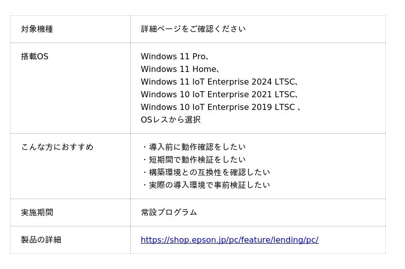 購入前に動作検証をしたい法人のお客様向けに、フルカスタマイズ可能なPCの無料貸し出しを実施しています。10月開始のキャンペーンが気になるけれどWindows 11/10 IoT Enterprise LTSC搭載モデルが初めてで不安、という方もぜひご活用ください。