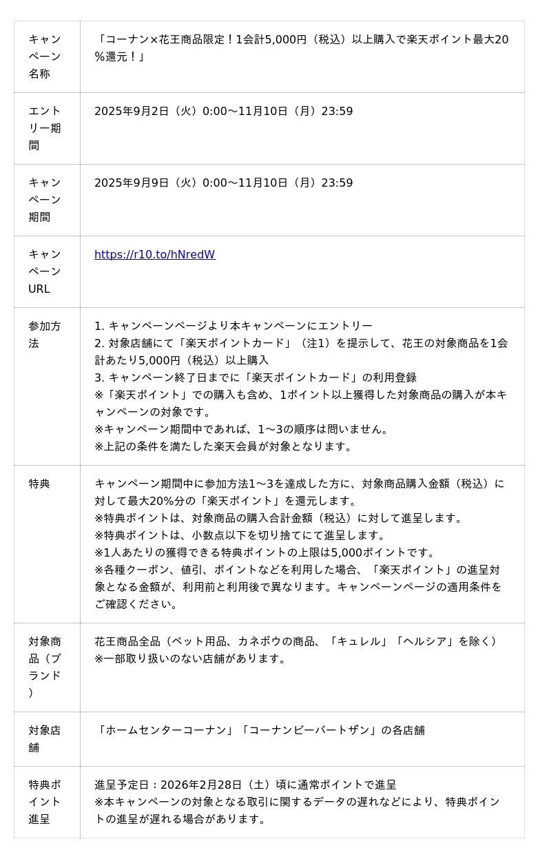 本キャンペーンは、キャンペーン期間中にキャンペーンページよりエントリーのうえ、コーナンが運営する「ホームセンターコーナン」「コーナンビーバートザン」の店舗で「楽天ポイントカード」(注1)を提示して、花王の対象商品(注2)を1会計あたり5,000円(税込)以上購入した方に、対象商品の購入金額(税込)に対して最大20%分の「楽天ポイント」を還元します。