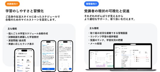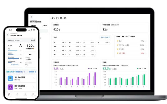 LeaPro「1級 建築施工管理技士(一次)」は、現場での実務にあたりながら資格取得を目指す方々にとって、スマホ1つで学習できる、オンライン学習アプリです。利用者が業務と並行しながら資格勉強を進めるための個人学習スケジュールを自動作成することができ、管理者はそうした利用者(社員や内定者)の学習進捗をひと目で把握し、進捗やテスト結果に応じて学習リマインドをすることも可能。利用者と管理者がワンストップでつながり資格取得を目指せるのが特徴です。