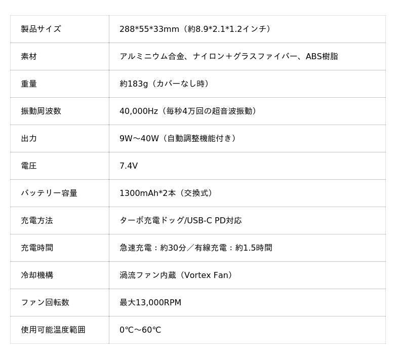 13000rpmのターボファンとアルミ合金ボディでNeoBladeは本体を効率的に冷却します。側面の通気口から空気が出入りするため、刃は常に冷たく、手も快適です。