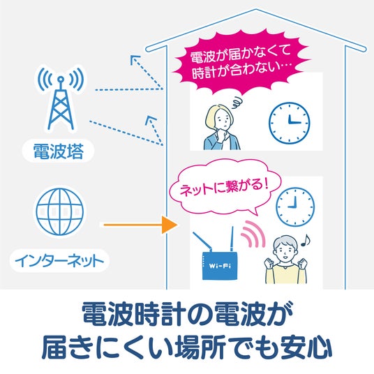 室内のネット環境(Wi-Fi(R))を利用して正しい時刻を同期Wi-Fi(R)環境さえあれば、インターネット経由で正確な時刻情報を取得できます。