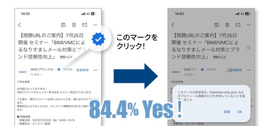 その結果、メール受信者の高いセキュリティ意識に反して、メール配信事業者におけるDMARC(なりすましメール対策設定)/BIMI(企業ロゴ付きメール)によるメールセキュリティ施策の普及は十分ではない実態と、その中で「BIMI(企業ロゴ付きメール)」の導入により、受信者がメールの正当性を直感的かつ容易に見分けられることが確認され、導入の明確なメリットが示されました。