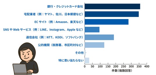 銀行・クレジットカード会社、宅配業者、ECサイト、通信会社、公的機関、SNSやWebサービスの順に回答数が多かった