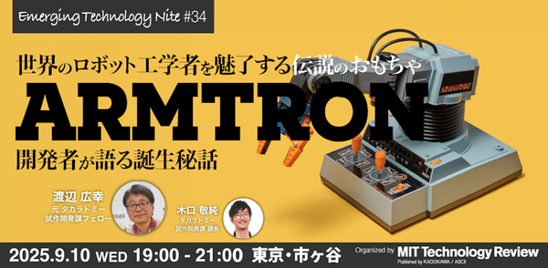 その開発者である渡辺広幸氏(元タカラトミー 技術開発部試作開発課フェロー)と、木口敬純氏(同課長)をお招きし、アームトロンに見られる設計思想・機構設計・試作プロセスを、一次情報として徹底解説するイベントが開催される。2025年9月10日(水)に開催される「世界のロボット工学者を魅了する伝説のおもちゃ「アームトロン」 開発者が語る誕生秘話 Emerging Technology Nite #34」だ。