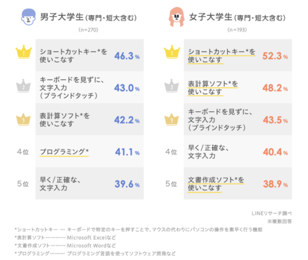 大学生(専門・短大含む)では男女ともに「ショートカットキーを使いこなす」が1位となり、女子大学生では、2位の「表計算ソフト(Microsoft Excelなど)を使いこなす」、5位の「文書作成ソフト(Microsoft Wordなど)を使いこなす」など実務スキル系も高めとなっている。