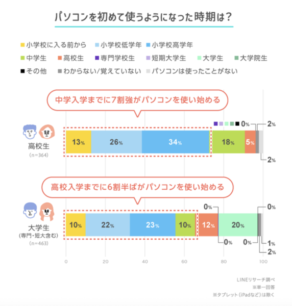 ICT教育が進んでいるが、今時の若者がパソコンを使い始める時期はいつなのか。全国の15~25歳の学生(高校生、専門学生、短大生、大学生、大学院生)の男女を対象としたLINEリサーチの調査(2025年8月)を見ていこう。