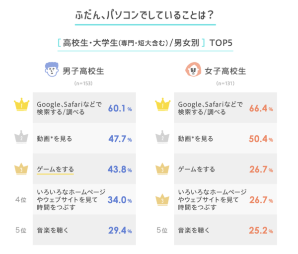 高校生では男女ともに「Google、Safariなどで検索する/調べる」が1位、「動画を見る」が2位だった。3位「ゲームをする」も男女共通だったが、特に男子高校生は43.8%と高くなっていた。