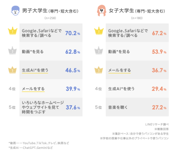大学生でも男女ともに「Google、Safariなどで検索する/調べる」が1位、「動画を見る」が2位だが、「生成AIを使う」も男女でランクインしており、特に男子大学生で46.5%と割合が高くなっている。