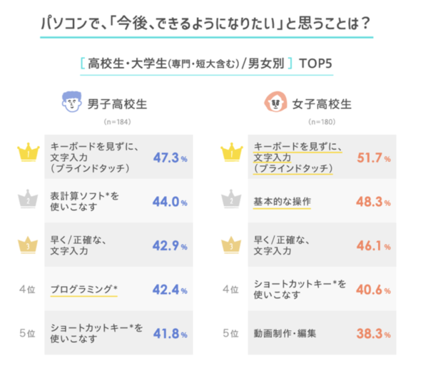 パソコンで「今後、できるようになりたい」と思うことを聞いたところ、高校生では男女ともに「キーボードを見ずに、文字入力」が1位に。