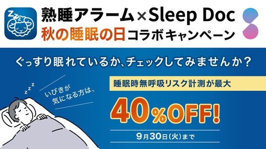 エムスリーとソニーグループの合弁会社である株式会社サプリム(本社:東京都港区、代表取締役社長:富山泰司、URL : https://www.sapplym.com/ )の睡眠時無呼吸リスク計測サービス「Sleep Doc」(URL : https://sleep-doc.jp/ )は、9月3日の「秋の睡眠の日」に合わせて、熟睡アラームと連携してキャンペーンを実施します。この機会にご自身の睡眠について見直しませんか。