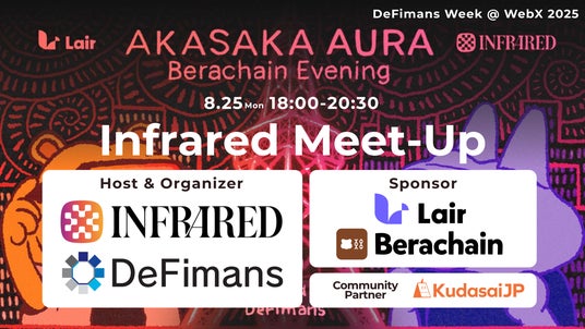 株式会社DeFimans(所在地:東京都港区、代表取締役:小野 暢思・佐藤 太思、以下「DeFimans」)は、Proof-of-Liquidity(PoL)を基盤とした流動性・チェーンインフラの総合プロトコルを展開するInfraredと共に、2025年8月25日(月)に「Infrared Meet-Up ~AKASAKA AURA Berachain Evening~」を開催しました。