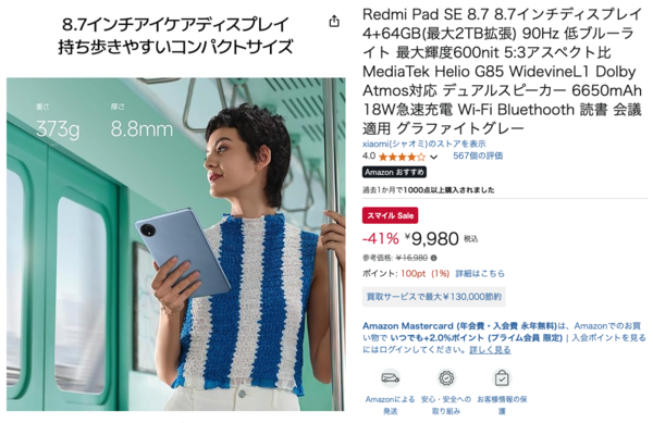 Amazonスマイルセールの目玉商品として、シャオミの激安タブレット「Redmi Pad SE 8.7」が登場。