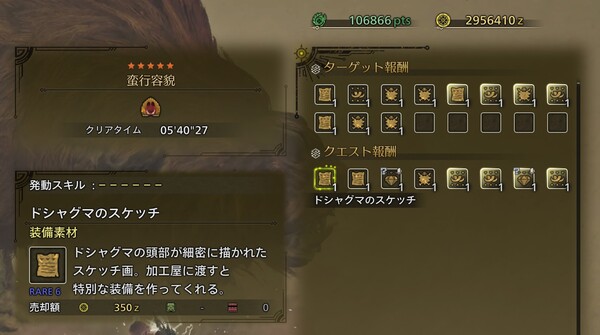 無事捕獲完了すると、クエスト報酬で「ドシャグマのスケッチ」が手に入る。1回のクエストにつき、1~2個だろうか。