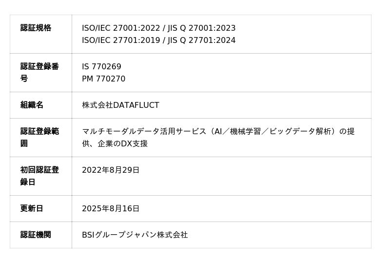 株式会社DATAFLUCT(本社:東京都渋谷区、代表取締役CEO:久米村 隼人)は、情報セキュリティマネジメントシステム(ISMS)の国際規格である「ISO/IEC 27001:2022 / JIS Q 27001:2023」及び「ISO/IEC27701:2019 / JIS Q 27701:2024」の認証を更新したことをお知らせします。