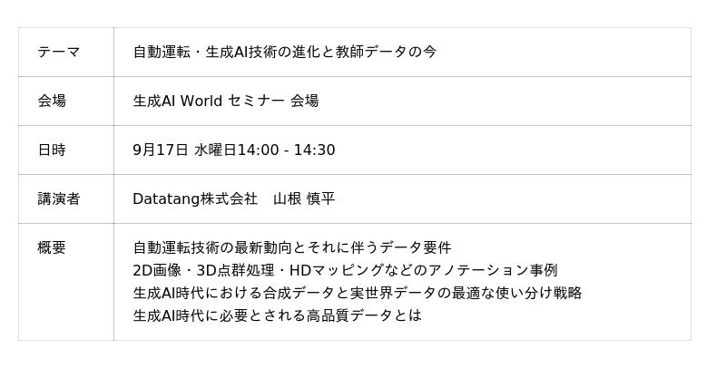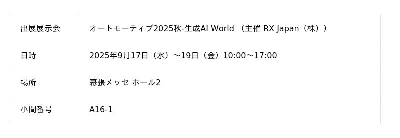 Datatang株式会社-Nexdataは、2025年 9月17日(水)~19日(金)に幕張メッセで開催される「オートモーティブワールド2025 秋」内「生成AI World」に出展します。