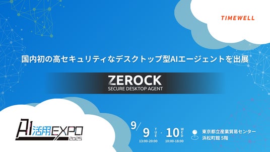 株式会社TIMEWELL(本社:神奈川県横浜市、代表取締役:濱本隆太、以下「TIMEWELL」)は2025年9月9日(火)・10 日(水)に東京都立産業貿易センター 浜松町館 5階で開催される AI活用EXPO2025に、国内初(*1)となる高セキュリティ型AIエージェント「ZEROCK」を出展することをお知らせします。本エージェントは、高度な社内文書検索や自動化機能を備え、企業の業務効率化を安全に支援することを目的としています。新機能として、顧客の企業情報・経歴に合わせたメッセージ配信を搭載し、展示会で体感ください。