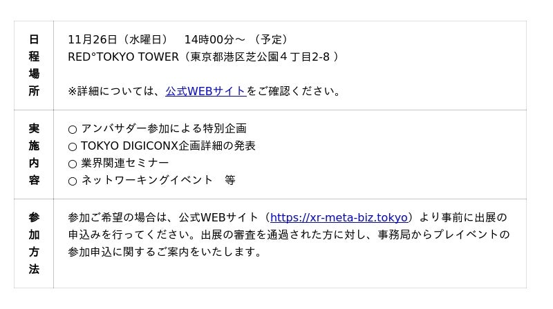 公式WEBサイト(https://xr-meta-biz.tokyo)内の登録フォームに必要事項を記入のうえ、エントリーしてください。