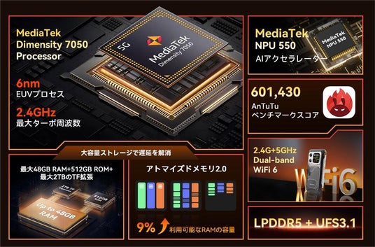 6nmプロセスのMediaTek Dimensity 7050チップセットを採用し、AnTuTuスコアは601,430点の高スコアを記録。最大48GB RAM(16GB物理+32GB仮想)と512GB ROM(最大2TB拡張可)をサポートします。