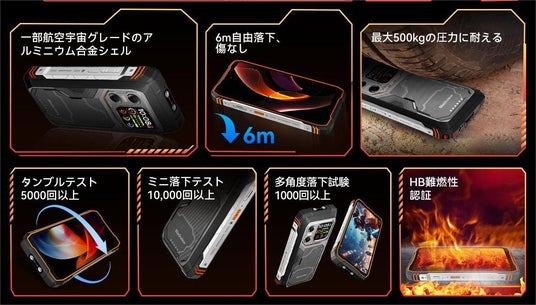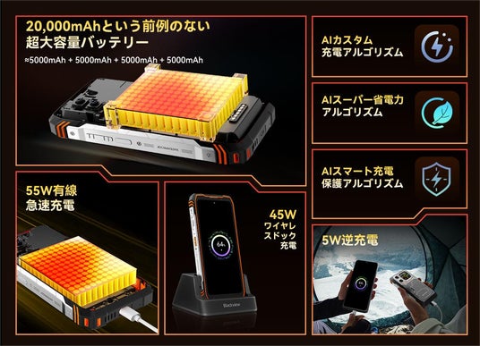 本製品は、20,000mAhの超大容量バッテリー、デュアルスクリーン、デュアルLEDライトを搭載したタフネスモデルであり、優れた防水防塵・耐衝撃仕様により、過酷な環境下でも長時間安心して使用できる設計となっています。
