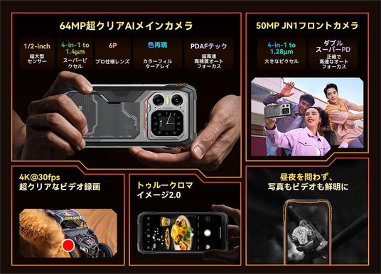 さらに、最新のAIアシスタント機能やMediaTek Dimensity 7050チップによる高性能処理、64MP超高精細カメラを備え、アウトドアから日常利用まで幅広く活躍する一台です。