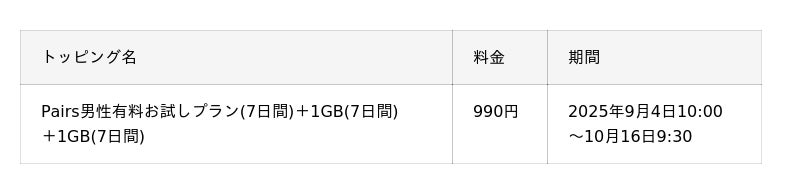 ※女性の方は本トッピングの「Pairs男性有料お試しプラン(7日間)」はご利用いただけません。
