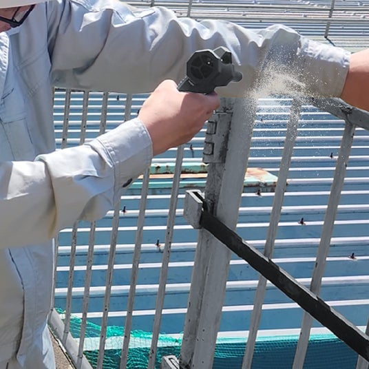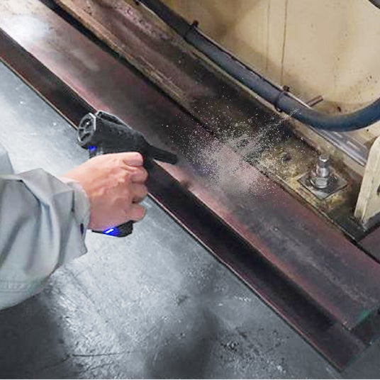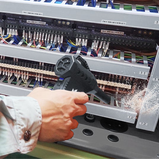 圧縮空気を用いたエアブローガンが現場に無い/届かない環境でも「ハンディエアブローガン」ならどこでもエアブローを実現。また、電動コンプレッサーと比較し同一流量あたりの電力コストを約95%削減。