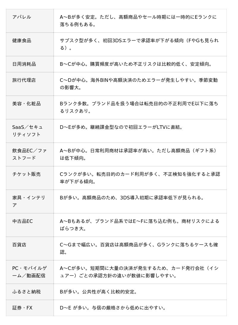 3Dセキュアを導入した企業では、全体的に決済承認率が下がる傾向が見られました。多くの企業が90%前後に集中し、B~Cランクに位置していますが、一部では3Dセキュア特有のエラー増加によってCランクからD・Eランクに低下する事例も確認されました。つまり、導入は不正対策上の効果がある一方で、運用設計が不十分な場合には承認率に負の影響を及ぼす可能性があることが明らかとなりました。