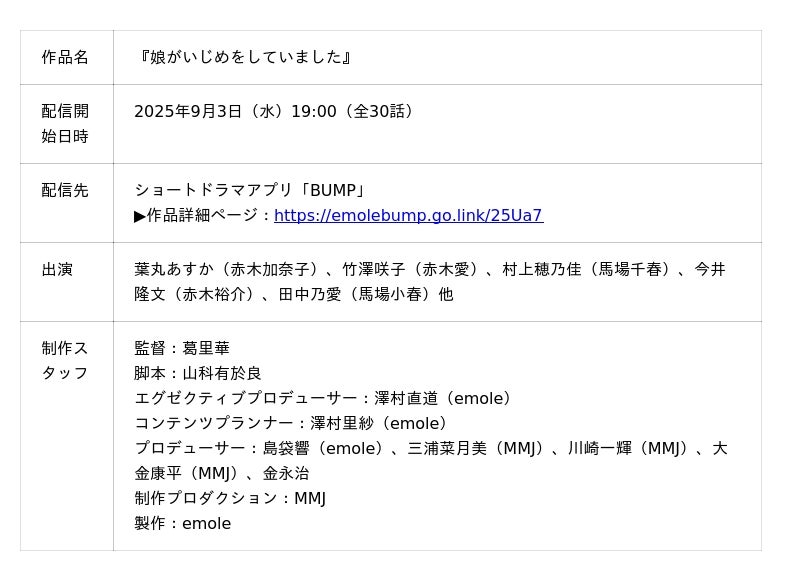 ショートドラマアプリ「BUMP」を運営するemole株式会社(本社:東京都目黒区、代表取締役:澤村直道)は、しろやぎ秋吾による人気コミック『娘がいじめをしていました』(KADOKAWA)を実写化した「BUMP」オリジナルショートドラマを2025年9月3日(水)19時より「BUMP」独占で配信開始しました。原作コミックは電子売上が1億円を突破し、SNSでは「胸がつまる」「これは他人事じゃない」といった声が多数寄せられ大きな話題となりました。