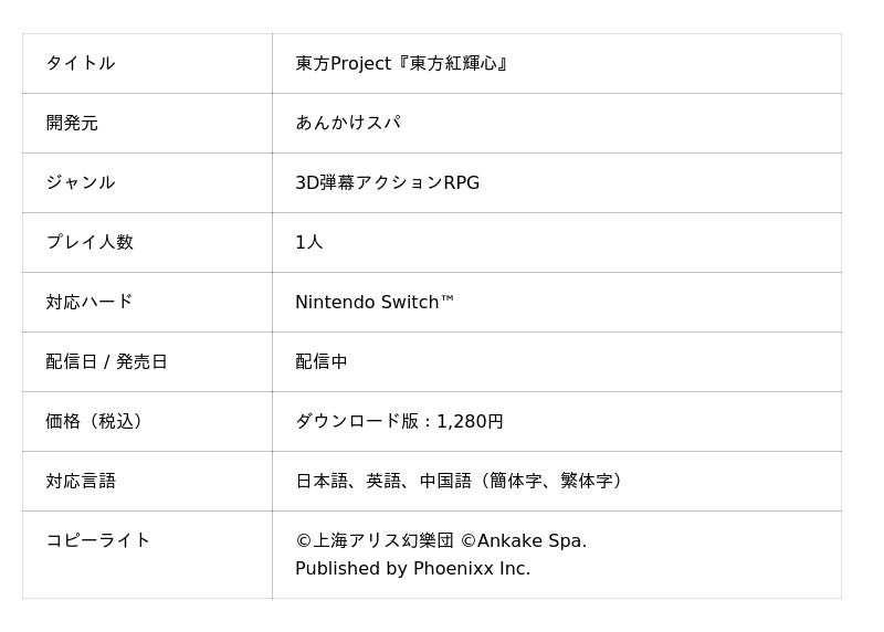 株式会社Phoenixx(フィーニックス)(東京都武蔵野市、代表取締役社長:坂本 和則)は、本日9月4日(木)より、3D弾幕アクションRPG、「東方Project『東方紅輝心』」をNintendo Switch(TM)向けに、配信開始したことをお知らせいたします。また、配信開始にあわせて、9月4日(木)~9月17日(水)の期間にて20%OFFのローンチセールを実施いたします。