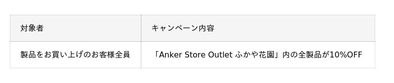 この度オープンを記念し、2025年9月11日(木)~ 2025年9月23日(火・祝)の13日間限定で「Anker Store Outlet ふかや花園」内の全製品を10%OFFでご購入いただけるキャンペーンを実施します。