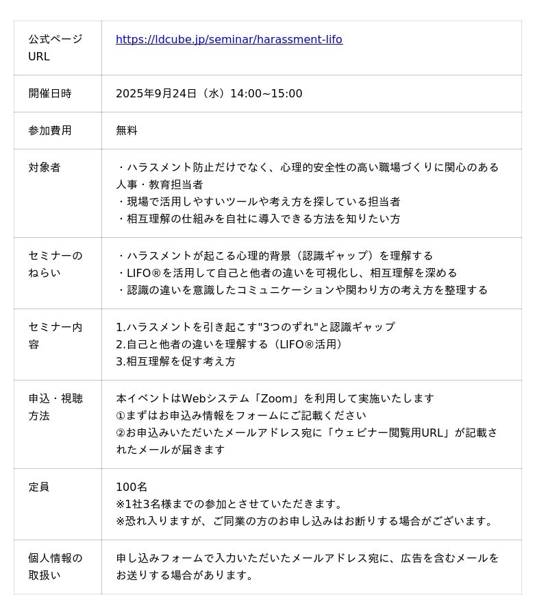 「ハラスメントを引き起こす3つの"ずれ"とは ~認識ギャップを解消し、心理的安全性の高い職場をつくる!~」ウェビナーを開催(9月24日14:00~15:00)株式会社LDcube