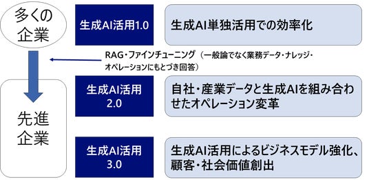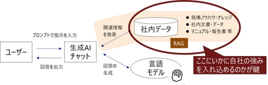 一般論での回答ではなく、自社のデータやナレッジ、各種ドキュメント、マニュアル・報告書等をRAG(Retrieval Augmented Generation)として参照させて自社の業務や培ってきた強みに即した回答をさせることが重要となります。いかに自社の強みをRAGとして生成AIに連携し、「自社だからこそのAI活用」「自社だから発揮できるAIの強み」を発揮し育てていくかが重要です。