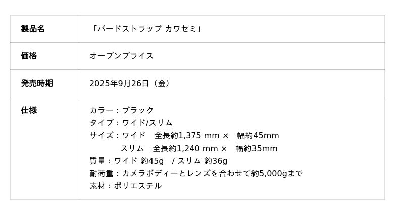 野鳥愛好家に人気なカワセミのデザインをジャガード織りで施した2タイプ(ワイド、スリム)のストラップが新登場。ワイドは主にカメラ向け、スリムは主に双眼鏡向けでご使用いただけます。ワイドとスリムの2タイプを併用し、カメラと双眼鏡を同時に携帯しても互いに干渉しにくいよう、長さに配慮した設計となっています。
