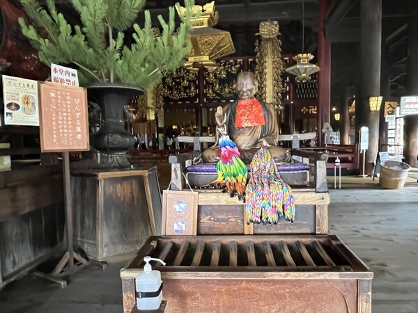 少し話が前後しますが、本堂に入って一番最初に出会うのが「びんずるさま」と呼ばれている「びんずる尊者像」です。16人いたお釈迦さまの弟子の一人で、痛みなどの苦を取り除く神通力がとても強かったのだとか。例えばひざが痛い人は、びんずるさまのひざをなでるというように、自分の患部と同じところをなでると神通力にあやかれるといわれています。