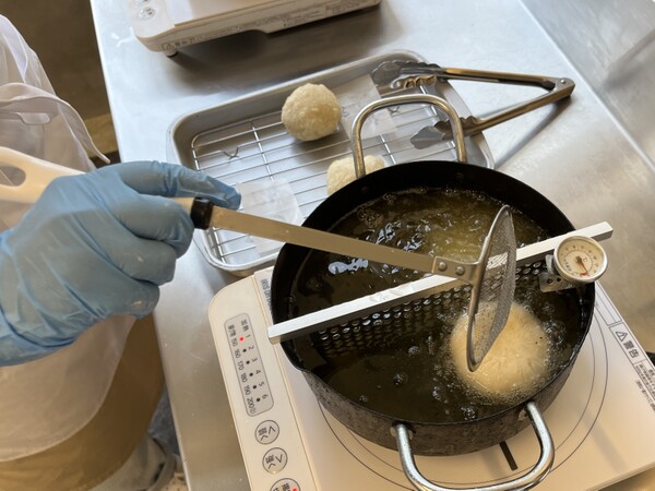 いろは堂のおやきは揚げ焼きスタイルなので、作ったおやきは油の中へ。いったん沈んだおやきが浮いてきたら取り出してオーブンで焼き上げます。
