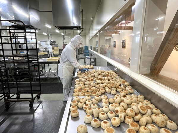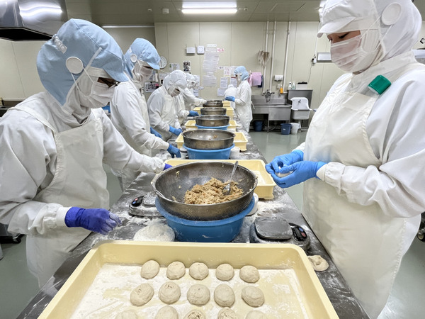 工場見学ゾーンは通常撮影禁止ですが、今回は特別に中に入らせてもらいました。工場では1日平均1万個、年間500万個のおやきを作っていて、その工程の大半が人の手で行われています。生地の計量などは機械化されていますが、包むのも揚げるのもなんとすべて手作業! 地元で親しまれているグルメだからこそ、地元の皆さんの手がしっかり入ってよりおいしいおやきになっているんですね。