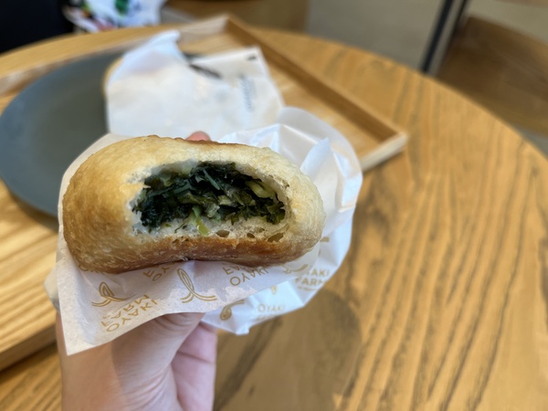 おやきは持ち帰ることもできますが、私はアツアツのうちに食べたかったのでイートインスペースでいただくことにしました。揚げているから表面はカリッとしていて、噛みしめるともちもちふわふわで、揚げパンみたいな食感でおいしい!