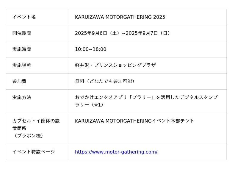 「人流の創出で、地域経済・地方経済を活性化する」をミッションに掲げるジオフラ株式会社(本社:東京都千代田区、代表取締役社長 社長執行役員CEO:尾崎 雄一、以下「ジオフラ」)と、新しいライフスタイルを提案する企画会社・カルチュア・コンビニエンス・クラブ株式会社(本社:神奈川県横浜市、代表取締役社長兼CEO:高橋 誉則、以下「CCC」)は、軽井沢・プリンスショッピングプラザにて開催される「KARUIZAWA MOTOR GATHERING 2025」にあわせて、おでかけエンタメアプリ「プラリー」を活用したデジタルスタンプラリーを実施いたします。