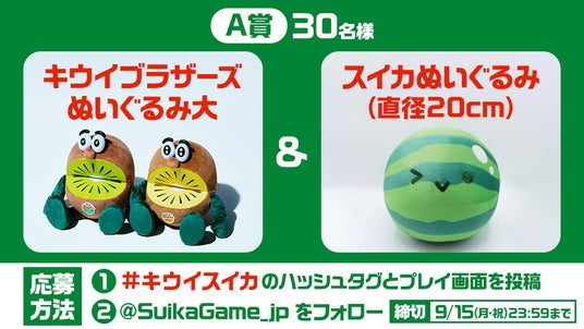 賞品:キウイブラザーズぬいぐるみ大 & スイカぬいぐるみ(直径20cm)