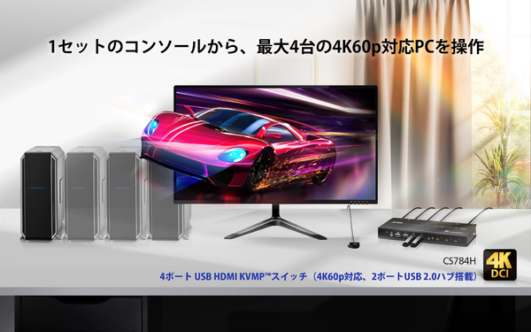 ATENジャパンは9月5日、新たに「CS784H」という4K60p対応の4ポートUSB HDMI KVMPスイッチを発売した。この製品は、1組のコンソールから最大4台のPCを切り替え操作できる機能を備えている。