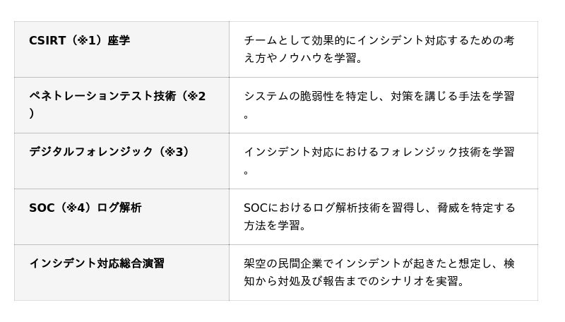 これは、陸上自衛隊システム通信・サイバー学校の教育課程であるサイバー共通課程における教育の一部を受託し、サイバーセキュリティの最先端で活躍する現役のホワイトハッカーが、最新の技術教育とセキュリティインシデント発生時の具体的な対応策について、演習を通じた実践的なトレーニングを行ったものです。