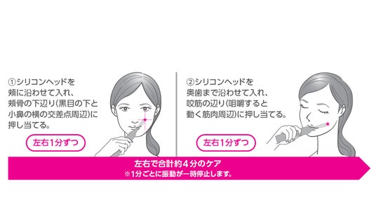 ・お好みの振動強度に調整し、左右4つの美圧ポイントに1分間ずつ押しあててください。1分ごとに振動が一時停止して、美圧ポイントの切り替えタイミングを教えてくれます。