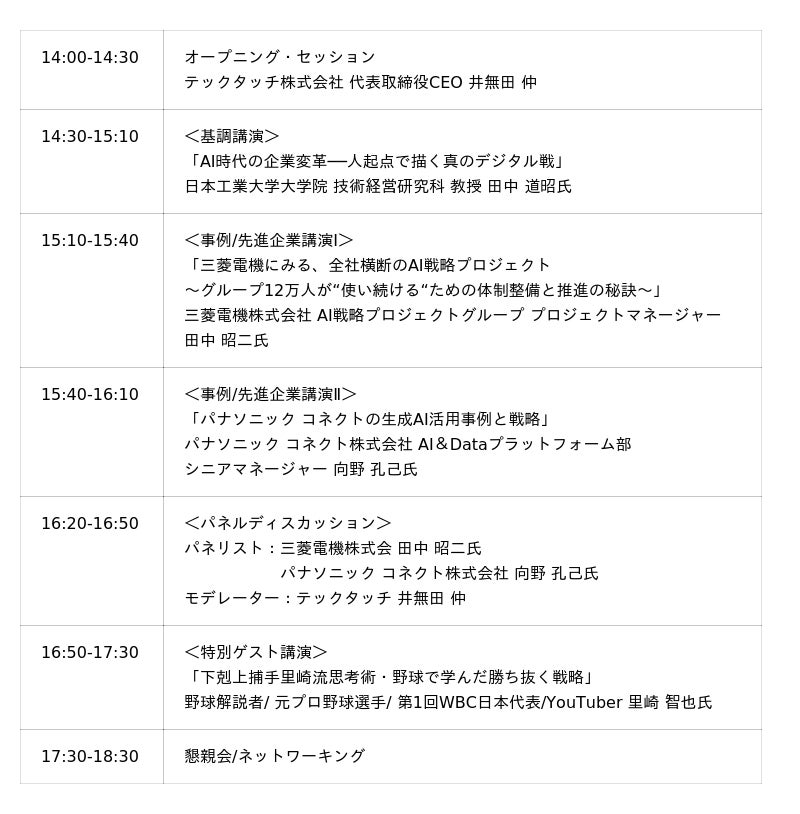 本イベントでは、AI/最新テクノロジーの最先端と事例など実践的な知見を学べます。三菱電機、パナソニック コネクトの責任者が語るAI活用・推進の秘訣に加え、『GAFA×BATH』の著者である日本工業大学大学院 田中 道昭教授がグローバル視点からAI戦略と日本企業の今後を解説。さらに、元プロ野球選手の里崎 智也氏が組織や人材の可能性をテーマに特別講演を行います。AI活用の課題を抱える経営層やリーダー層にとって、人起点でのAI活用を導く設計と戦略を深掘りできる貴重な機会となっています。
